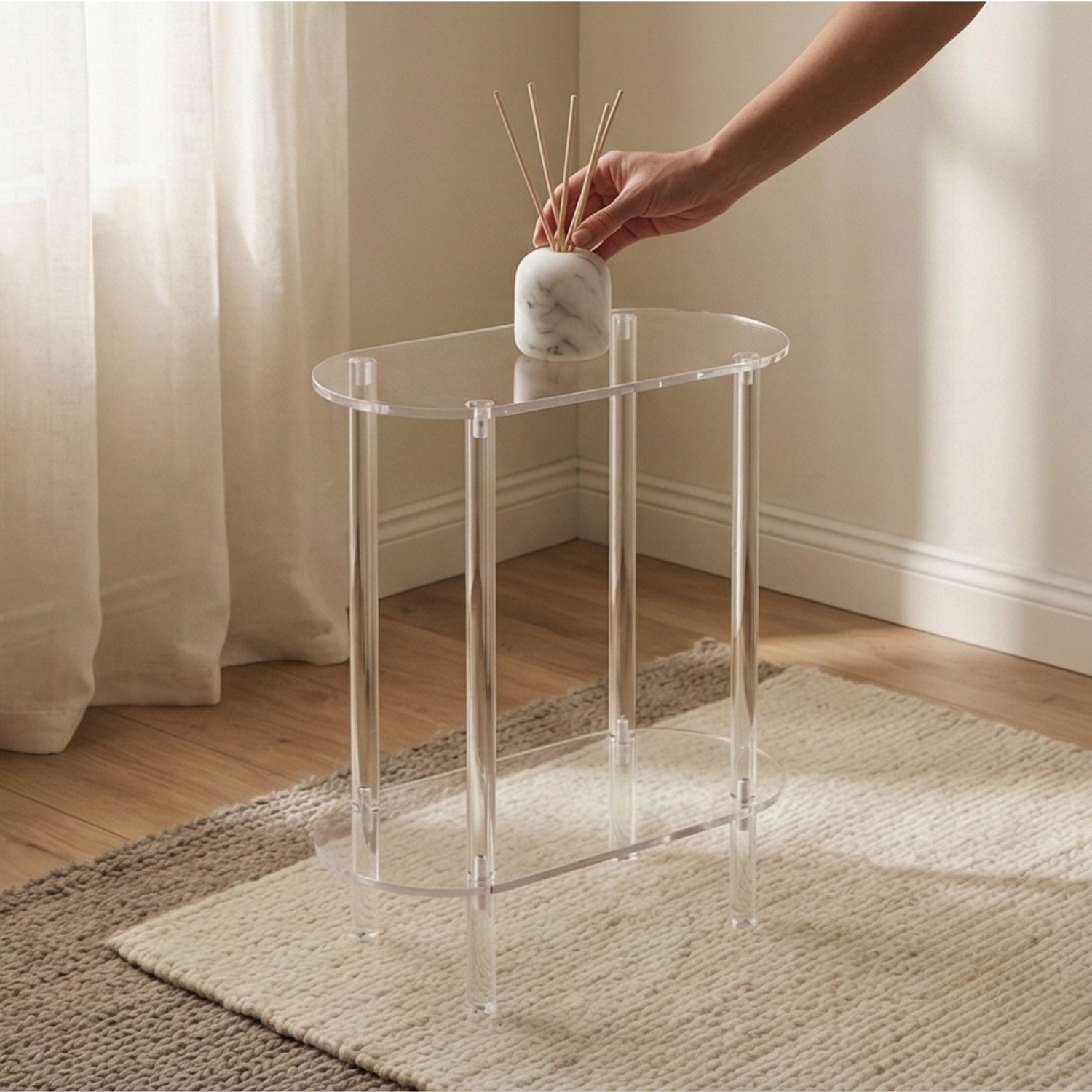 Conçue en acrylique transparent, elle capture la lumière naturelle et s’intègre discrètement dans tout type d’intérieur. Son design ovale et ses lignes élancées apportent une touche de douceur et de fluidité, très pratique pour les petits espaces.