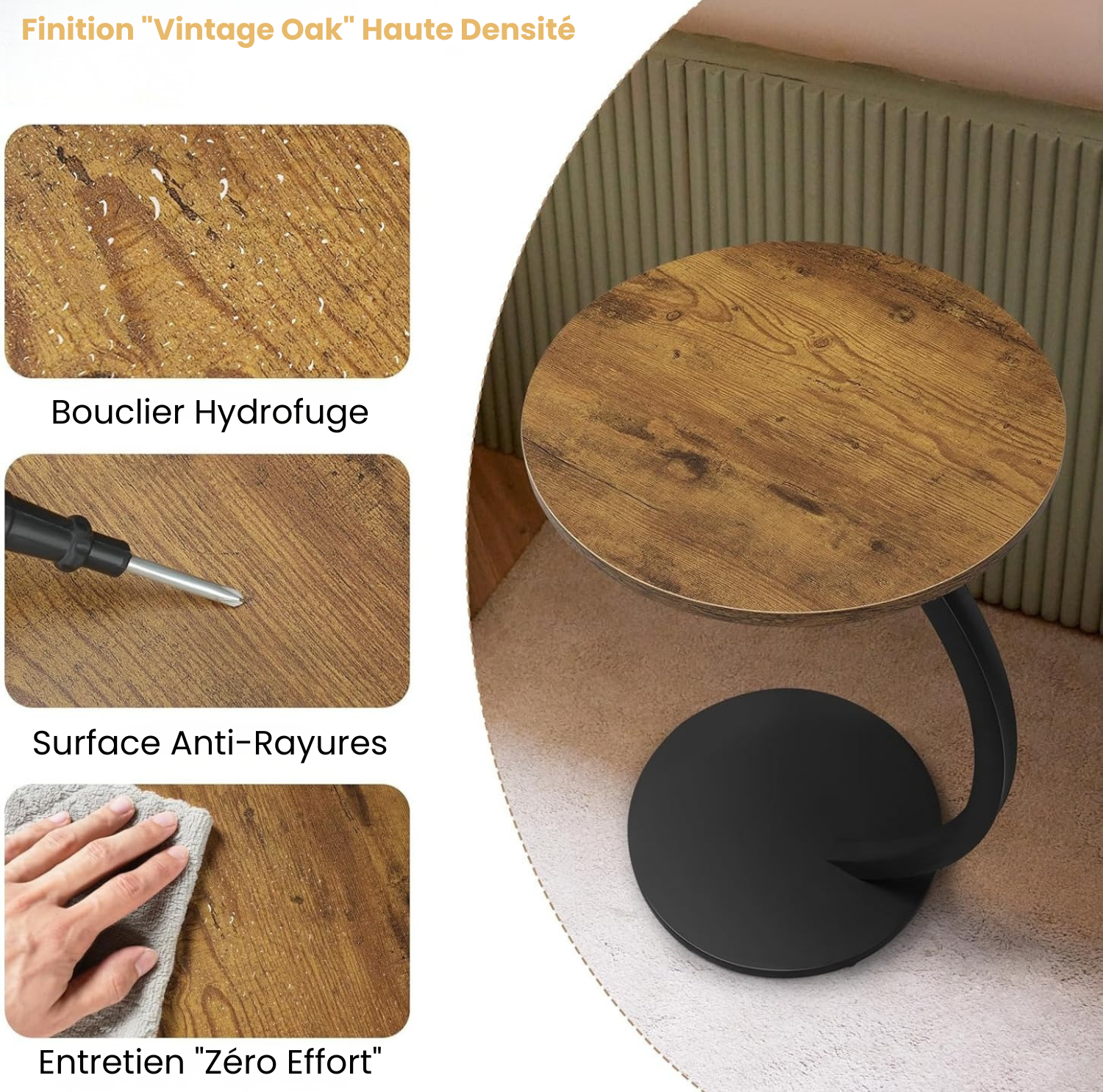 Le plateau rond (Ø 40 cm) offre une finition Chêne Vintage réaliste qui ne craint rien. Traité pour être hydrofuge et anti-rayures, il accueille vos cafés brûlants et vos clés sans laisser de trace. Un coup de chiffon humide, et l'éclat revient.
