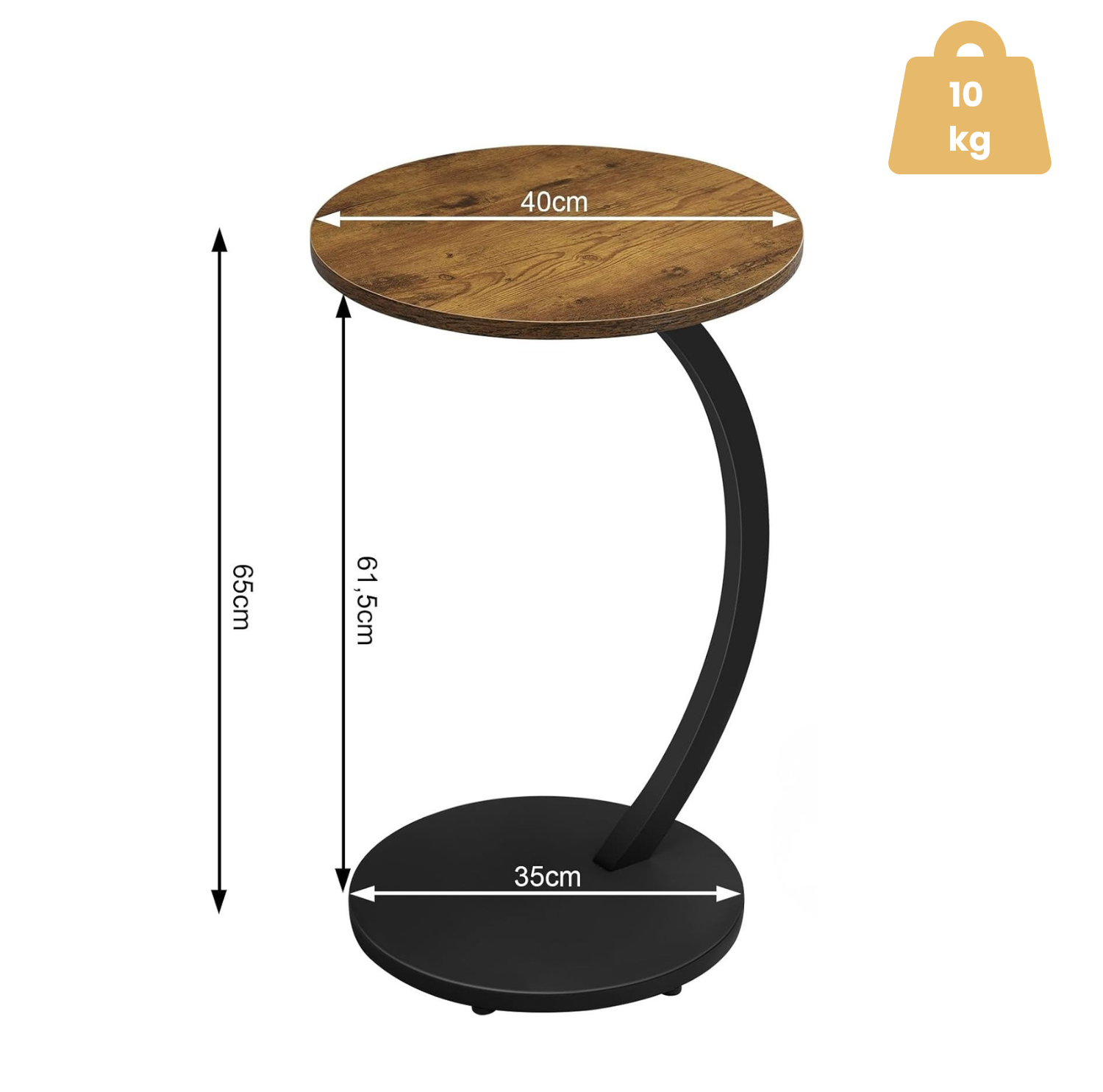 Une table d’appoint ronde alliant bois et métal, au design en forme de C. Compacte, élégante et stable, très pratique comme bout de canapé, table de chevet ou support pour ordinateur.