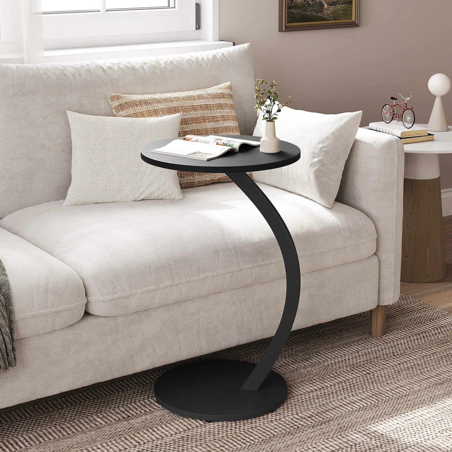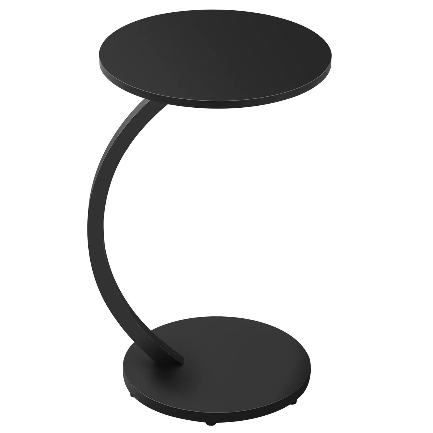 Table d’appoint ronde alliant bois et métal, au design en forme de C. Compacte, élégante et stable, idéale comme bout de canapé, table de chevet ou support pour ordinateur.