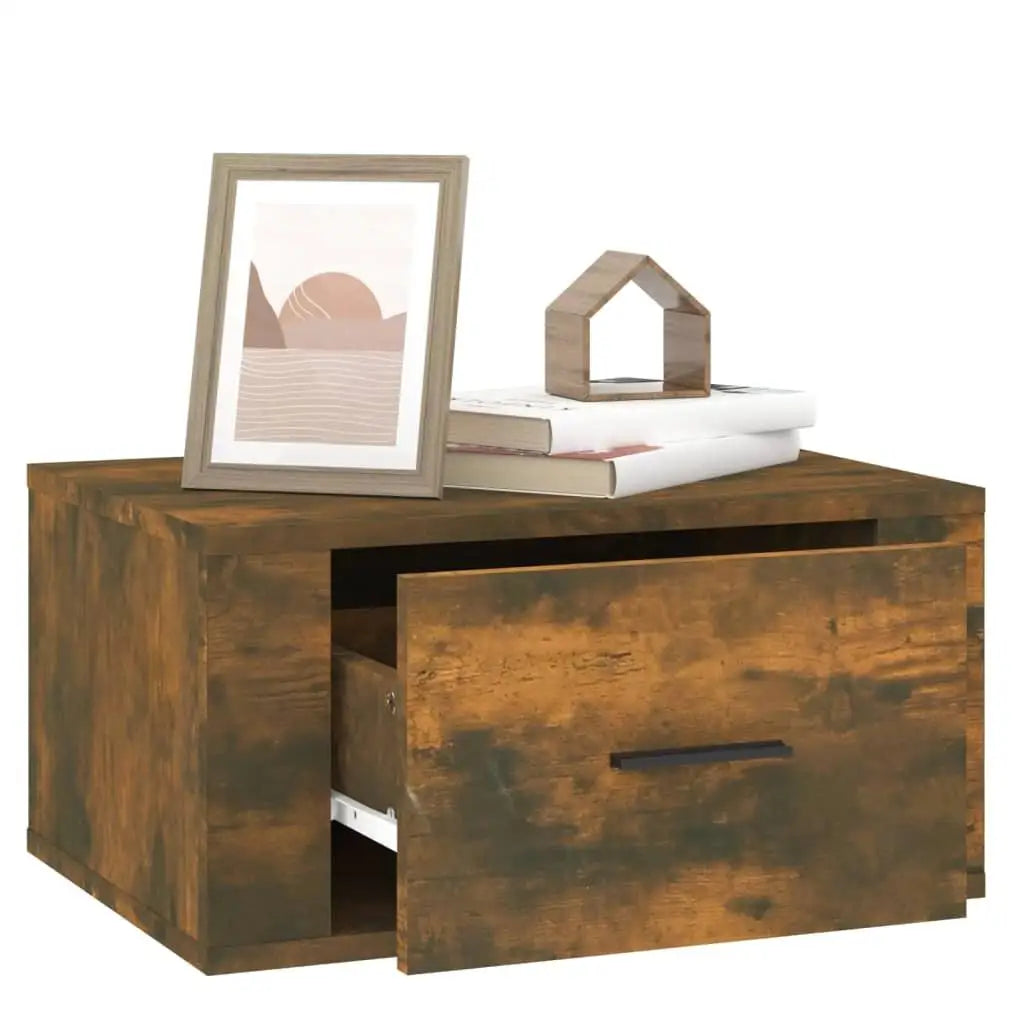 Cette table de chevet murale en bois de chêne fumé allie esthétique naturelle et praticité moderne.