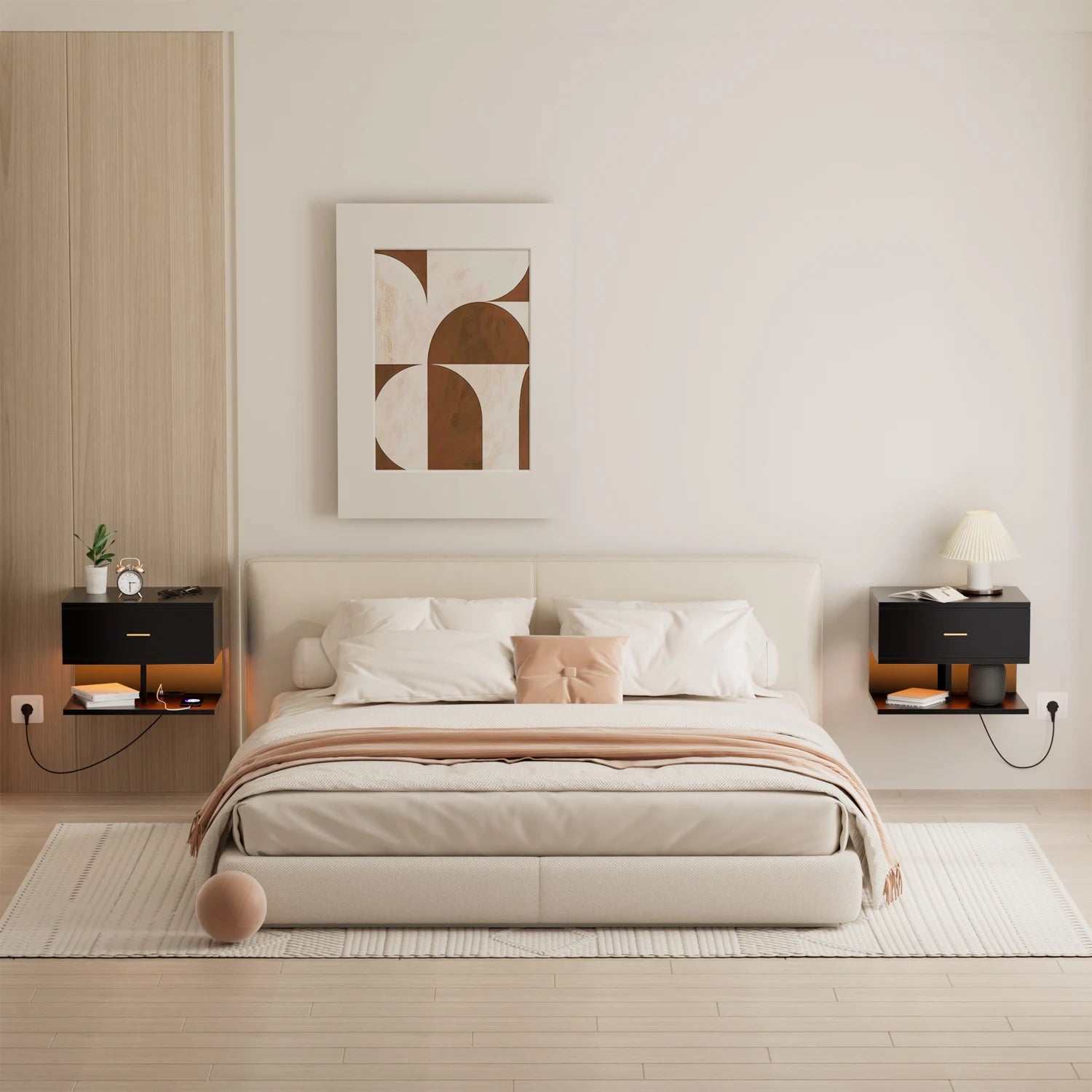 Compacte, lumineuse et fonctionnelle — cette table de chevet murale libère l’espace au sol tout en intégrant un système LED et une station de recharge discrète. L’équilibre parfait entre confort moderne et design épuré.