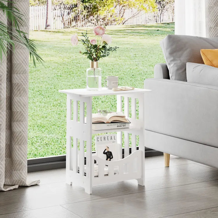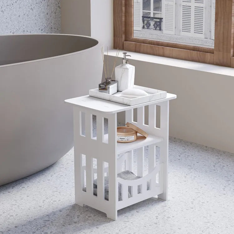 Table de chevet compacte et ajourée, idéale pour les petits espaces. Design blanc moderne, montage facile sans outils, et rangement sur trois niveaux pour allier légèreté et praticité.