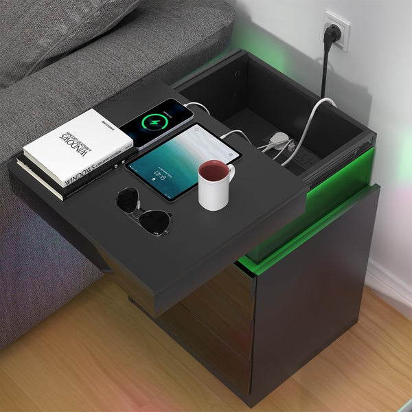 Une table de chevet moderne et technologique avec éclairage LED RVB, station de charge intégrée et 3 tiroirs coulissants dissimulés.